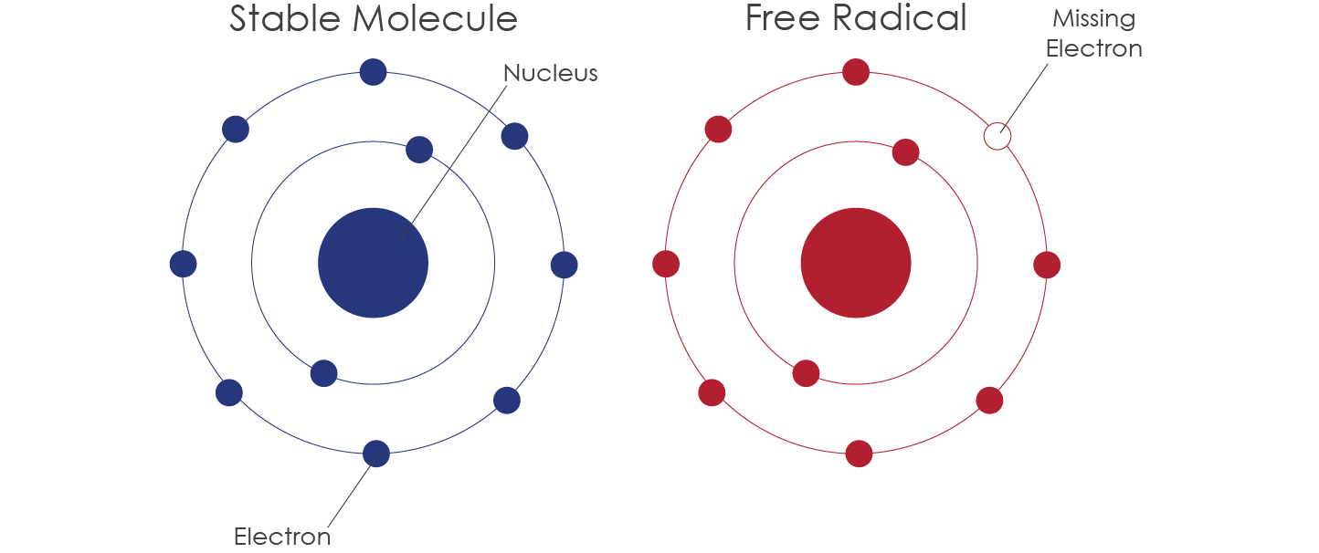 In very simple terms, a free radical is an atom with an “unpaired electron”. This atom is called a free radical and is “very reactive” in that it tries to stablize itself by seeking out another electron from another otherwise stable atom with “paired electrons”. This action results in a “chain reaction” and that is when “excessive free radical activity occurs”.